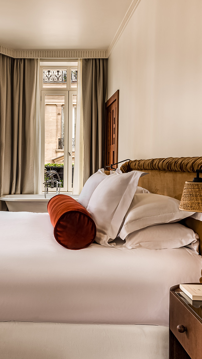 The hotel is styled with elegance and lightness at every turn. From the decadently marbled bar to the authentically chic spaces with original features, the peaceful rooms feel like a home from home. Romantic curves frame textured wood, with bright design accents setting a relaxed but refined tone.