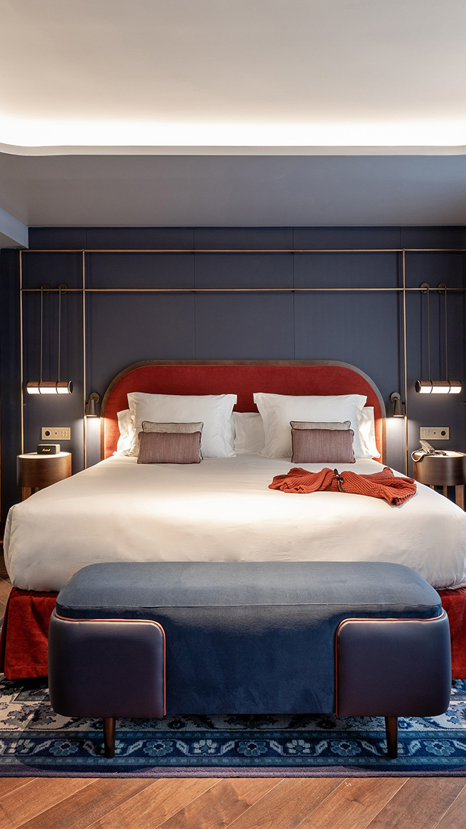 You’ll enter the hotel via a ‘members only’ library entrance, leading into a lobby of emerald walls and velvet drapery. Antique mirrors and a coved wood ceiling add to the feeling of playful mystery – a tone reflected in the colourful rooftop Sky Lounge. And the extravagance doesn’t stop there. Each room overflows with the charm that gives this hotel its edge: warm, deep hues and bronze accents, romantic lamps and mirrors – and a bathroom that takes its cues from the glazed mosaics of the Alhambra.