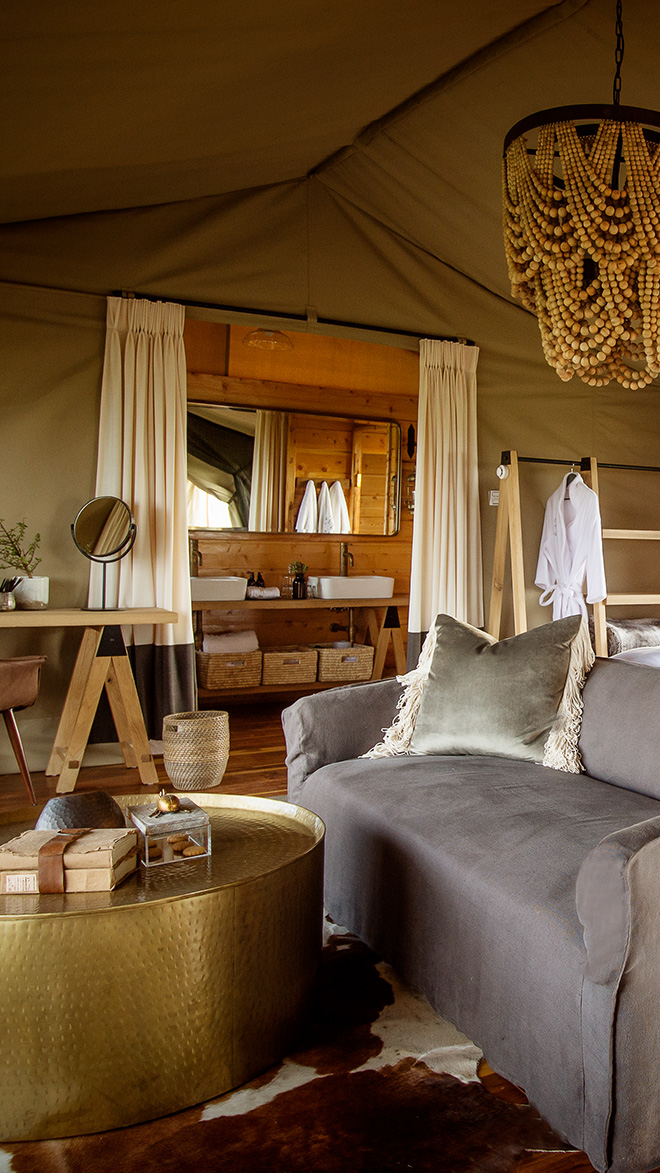 Migrate to the dining area where the opulence continues. Airy and open plan, the décor takes on the earthy tones of the surrounding bush, while deep armchairs and a selection of books invite moments of calm. This communal space is ideal for elegant dinners with fellow guests, swapping stories of the day’s sightings – or ask the attentive team to provide refreshments from the privacy of your own veranda. As the sun sets, enjoy the peace with a glass of wine, then claim a seat around the campfire to plan tomorrow’s adventure.