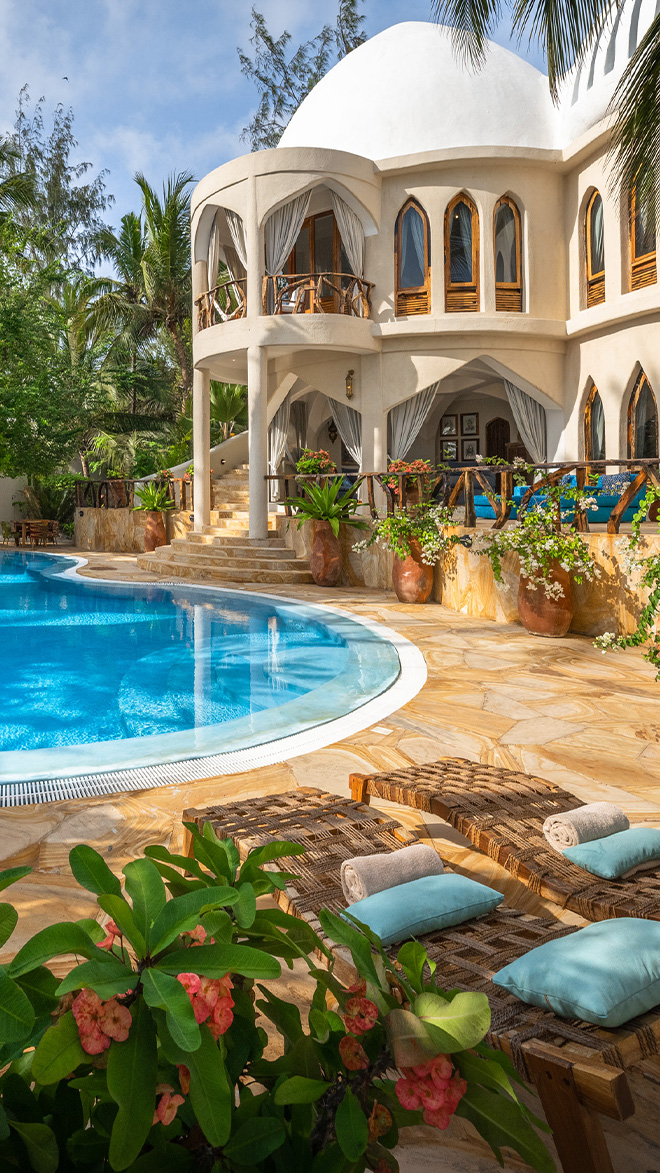 Taking inspiration from the stunning shoreline – all dazzling sands and crystalline turquoise waters – each villa is a gently-curved oasis in white, with private pools sheltered by orchid-petal walls. Lush vegetation provides shade and birdsong, and interiors continue the natural feel – light, bright and spacious. In a nod to the island's Arab history, each villa is individually crafted with circular rooms, domed roofs and arched windows that complement the regional African art and furnishings. Beyond, stroll through swaying palms and head for the central pool and restaurant, housed beneath a towering ‘Makuti’ roof. Here you can experience the hotel’s culinary prowess, although with an ‘anywhere, anytime’ approach to dining, you’re welcome to choose your own picturesque spot to indulge. Enjoy a shady lunch amid the gardens, or a romantic dinner complete with a golden sunset – simply let the team or your butler know.